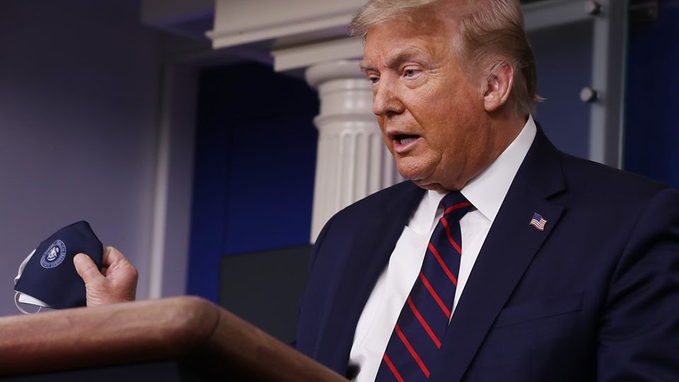 Mr Trump – who more than once referred to Covid-19 as the “China virus” – took a mask from his pocket in the briefing room, but did not put it on.