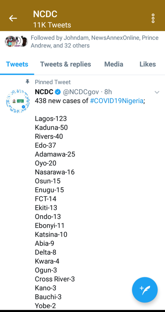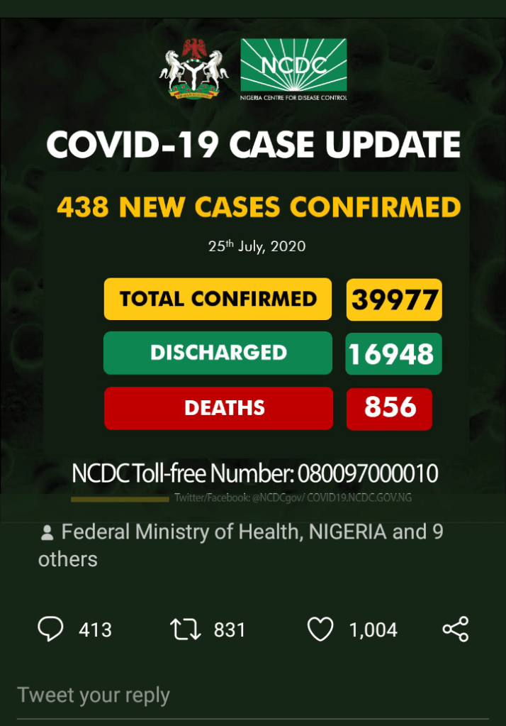 In what can be considered a relief, 438 cases of Covid-19 have been reported in Nigeria. A reduction from the 600 vicinity reported often in recent times.