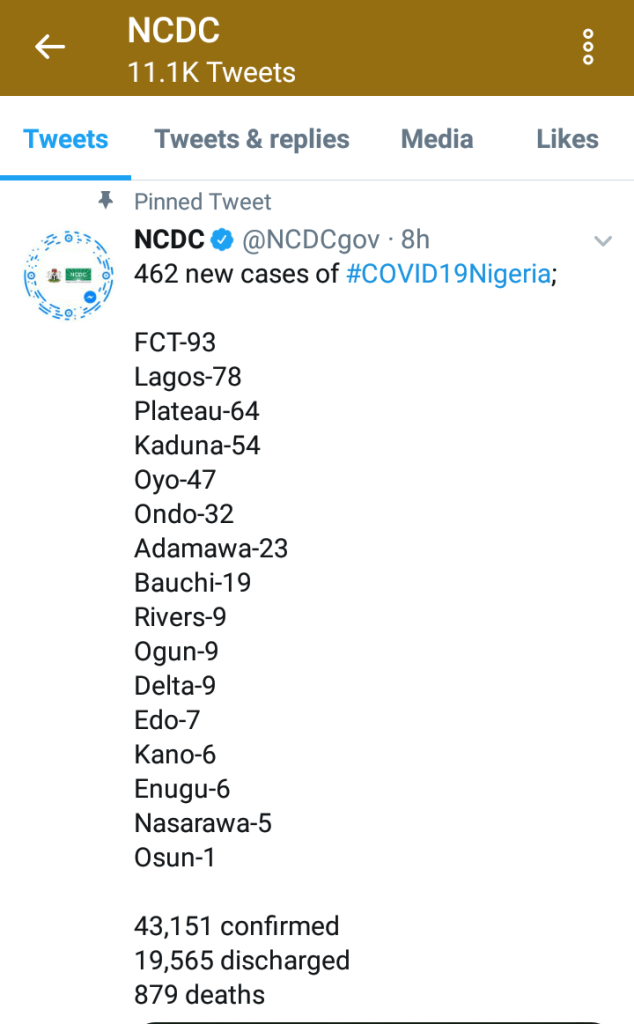 462 more cases of Covid-19 have been reported in Nigeria. That brings the total number confirmed so far to 43151 while 879 deaths have been recorded.