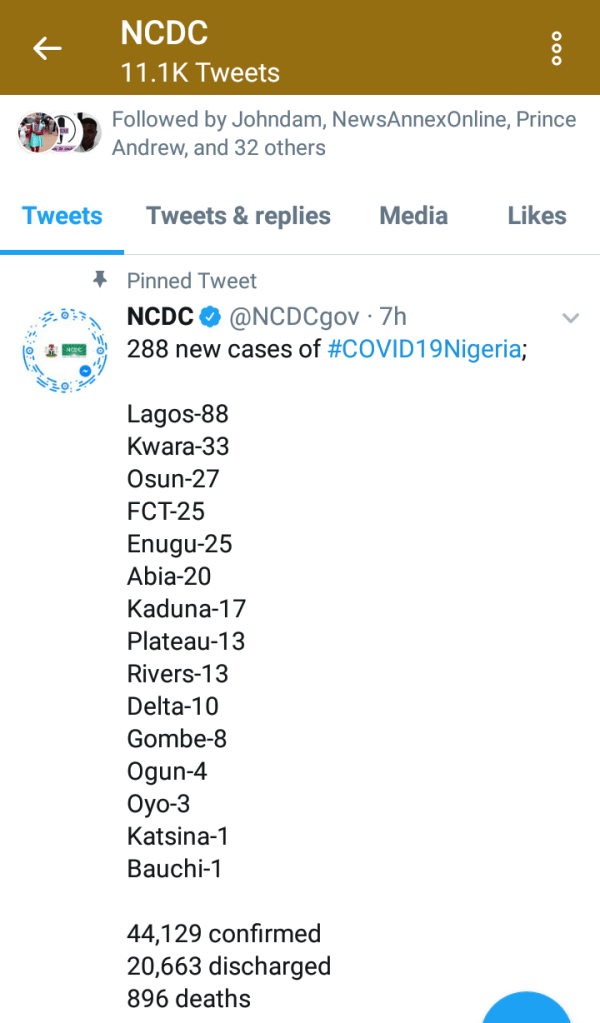 In a pleasant turn of events, new cases of Covid-19 have continued to decrease with 288 cases reported by NCDC. In previous weeks, the figures had ranged from 500 to 700.