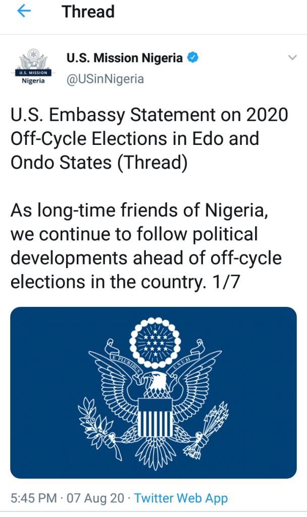 “The United States supports a democratic process where the will of the Nigerian people is reflected in the results, and does not favour any party or candidate,” the US Embassy said, in a comment over the Edo and Ondo state Governorship Elections.