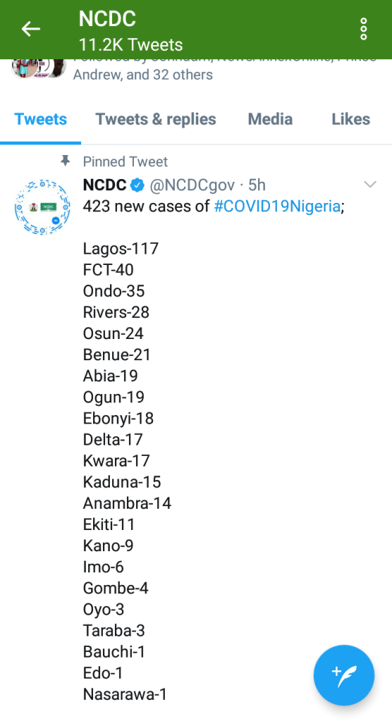 Lagos still leads with 117 cases followed by FCT with 40 cases. Nasarawa state has just 1 case.
