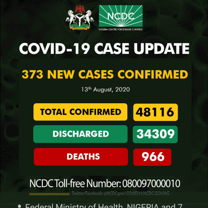 Nigeria seems to be succeeding in flattening the curve as number of cases continue to reduce with the NCDC announcing 373 fresh cases for 13 August 2020.