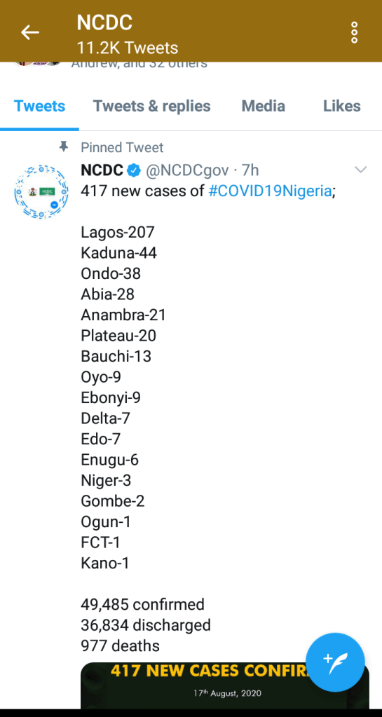 By the NCDC Update for August 17 2020, Lagos cases of covid -19 surged from below 100 the previous day to above two hundred yesterday. A total of 417 new cases were reported bringing the total number confirmed so far to 49485.36834 cases have been confirmed so far and 977 deaths have occurred.