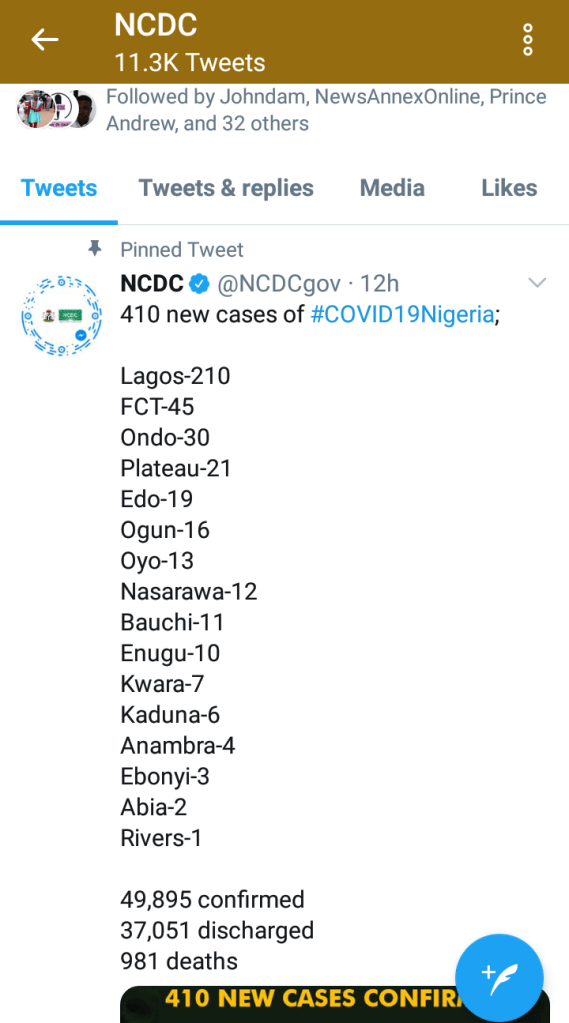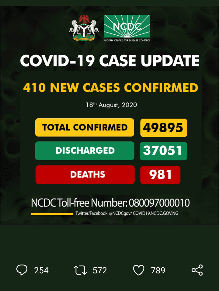 With 410 more cases confirmed,Nigeria will soon hit the 50,000 mark for confirmed cases of Covid-19.
