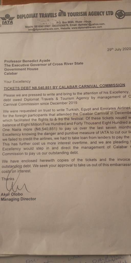 The travel agent that handled the air tickets of diplomats that participated in the carnival, Akor Otobo, lamented that the loan he obtained from a commercial bank to execute the contract was accumulating more interest.