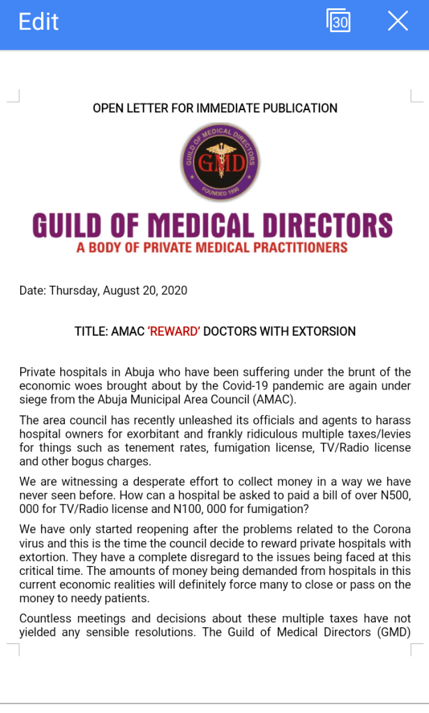 Countless meetings and decisions about these multiple taxes have not yielded any sensible resolutions. The Guild of Medical Directors (GMD) wrote a formal letter to the AMAC Chairman in 2019, intimating him that issues to do with taxation were still under consideration. The Honorable Minister of Health had actually set up a committee to review this: yet the council sends its thugs and even Police Officers to harass hospital staff and patients.