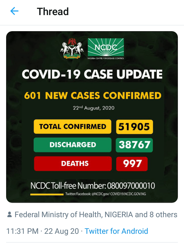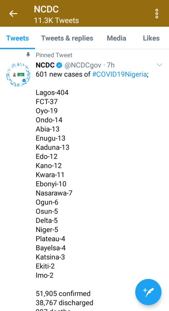 Out of 601 new cases of Covid-19 cases reported by the NCDC, Lagos topped the list with 404 cases. FCT is next with 37 cases, Oyo 19 and Ondo 14.