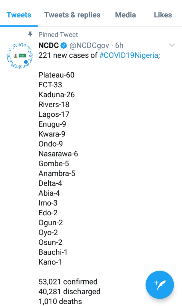 The curve seems to be flattening as 221 new cases of Covid-19 are reported by NCDC.