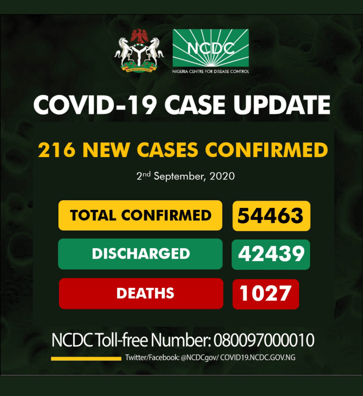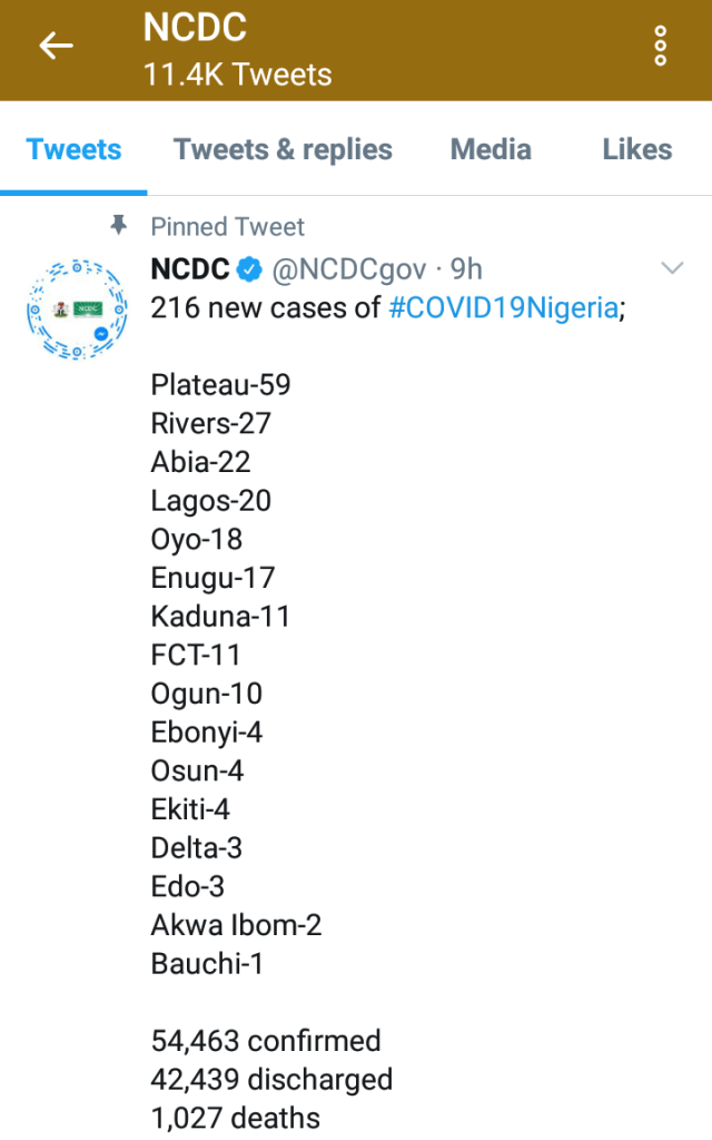 The NCDC reported 216 fresh cases with Plateau leading as it had 59 new cases.Rivers had 27,Abia 22 and Lagos 20 cases.Akwa Ibom has 2 cases whileBauchi has 1 case.