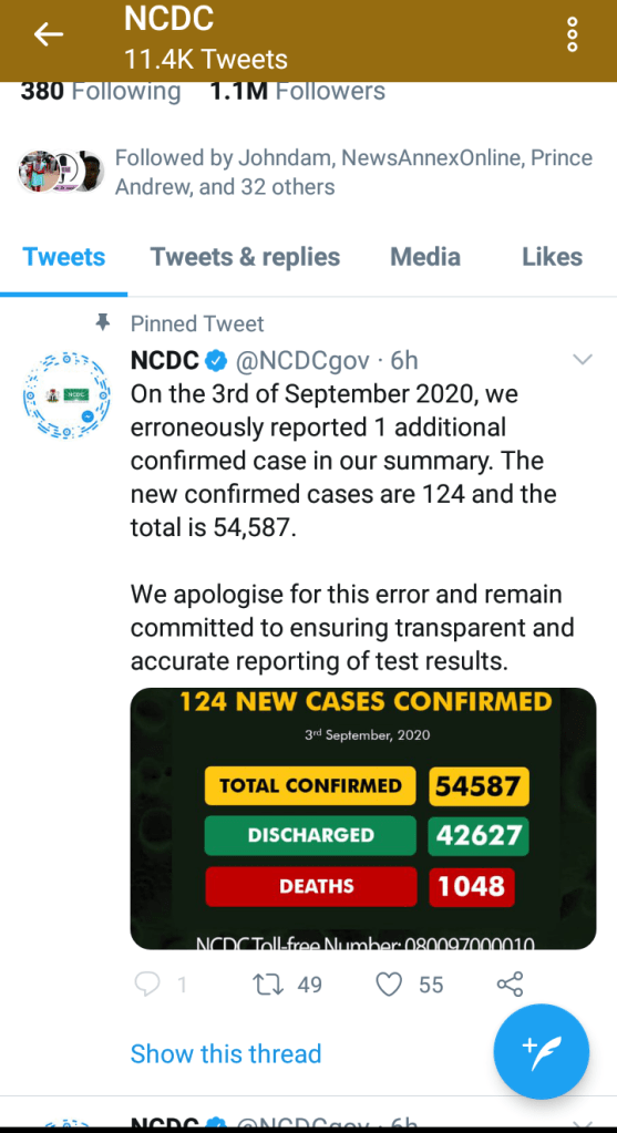 The NCDC says there was an error in its report that 125 cases of Coronavirus infections were recorded for 3 September, the correct figure is 124.