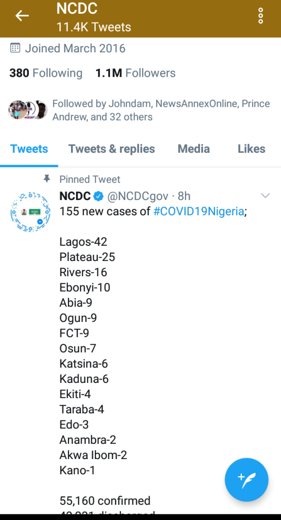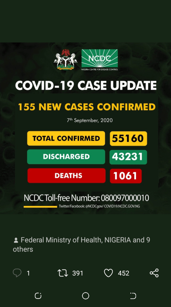 The NCDC has announced 155 more Covid-19 cases. The total confirmed so far is 55160 .While 43231 patients have been discharged, 1061 deaths have occurred.
