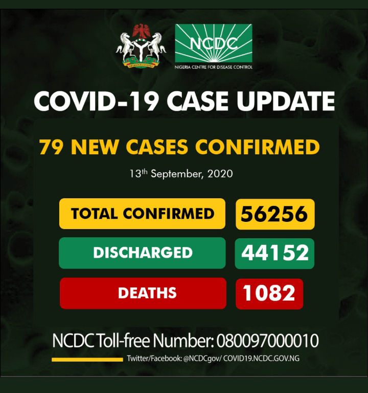 The NCDC has reported 79 fresh Covid-19 cases for September 13 2020. This is the first time in months below a hundred cases are being reported .