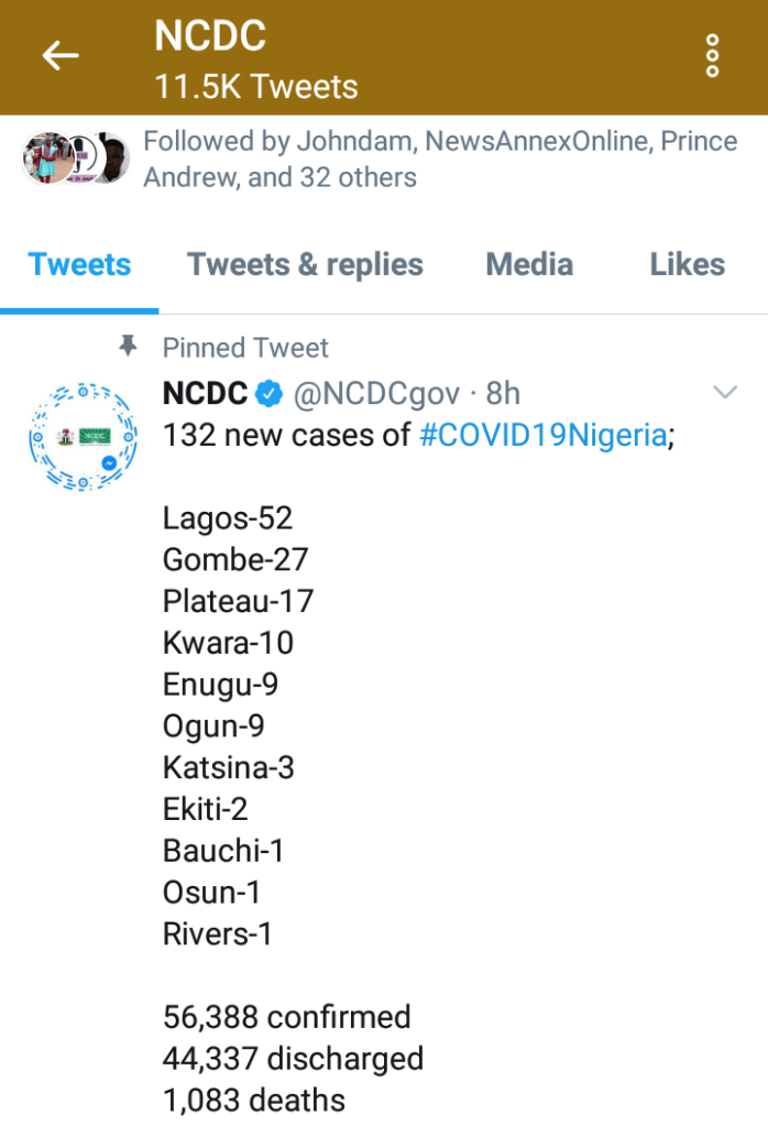 132 new cases of Covid-19 have been reported by the NCDC. That brings the total number of cases confirmed in Nigeria to 56388.