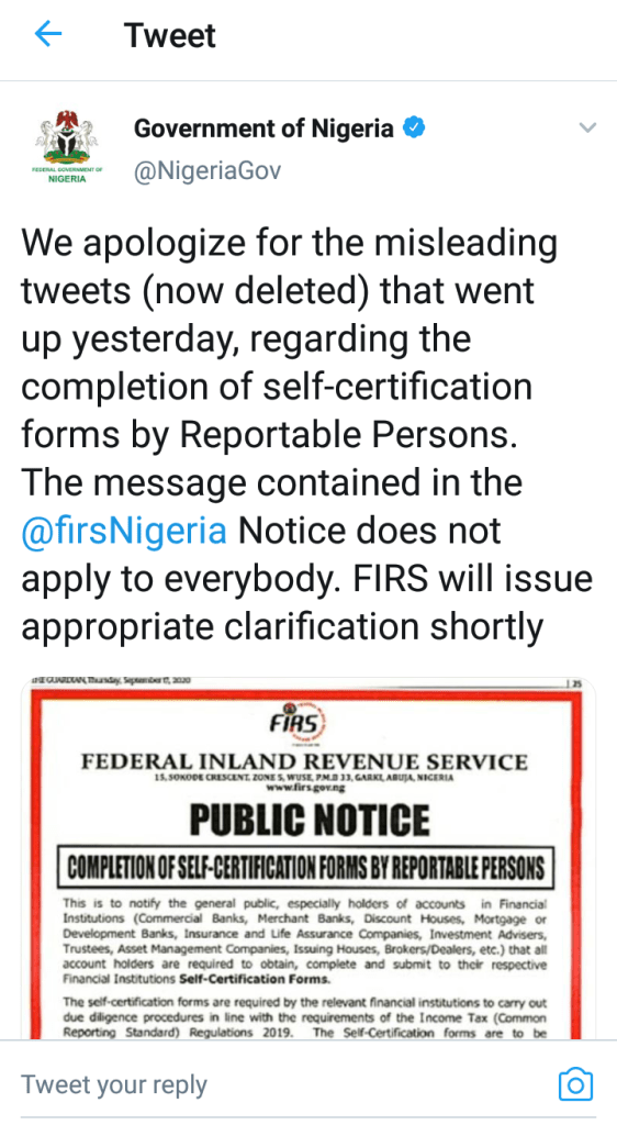 In another tweet on Friday morning, the Federal Government acknowledged that its earlier tweets were misleading and the notice by the Federal Inland Revenue Service (FIRS) does not apply to everybody.