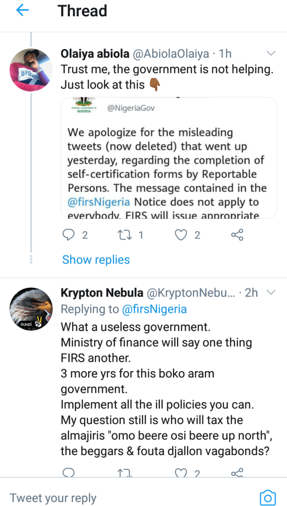 Following the apology by the Federal government and clarification by the FIRS, Nigerians on Twitter expressed disappointment and surprise. Others demanded more clarification, wondering if the reverse decision was taken following Thursday evening backlash on Twitter.