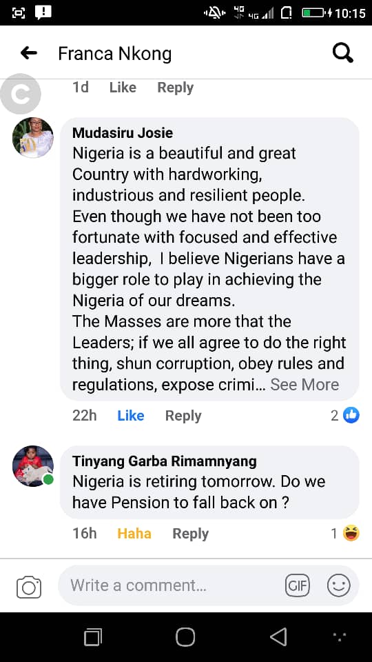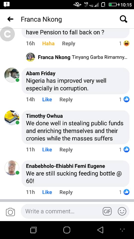 POLITICS Nigeria is 60 today. By your assessment how do we stand? What areas have we done well?_Ada Nkong October 1, 2020 Francisca Ogar Rate this:Share this: Click to email a link to a friend (Opens in new window) Email Click to share on WhatsApp (Opens in new window) WhatsApp TweetShare on TumblrLike Loading... Published by Francisca Ogar View all posts by Francisca Ogar Share this: Click to email a link to a friend (Opens in new window) Email Click to share on WhatsApp (Opens in new window) WhatsApp TweetShare on TumblrLike Loading...