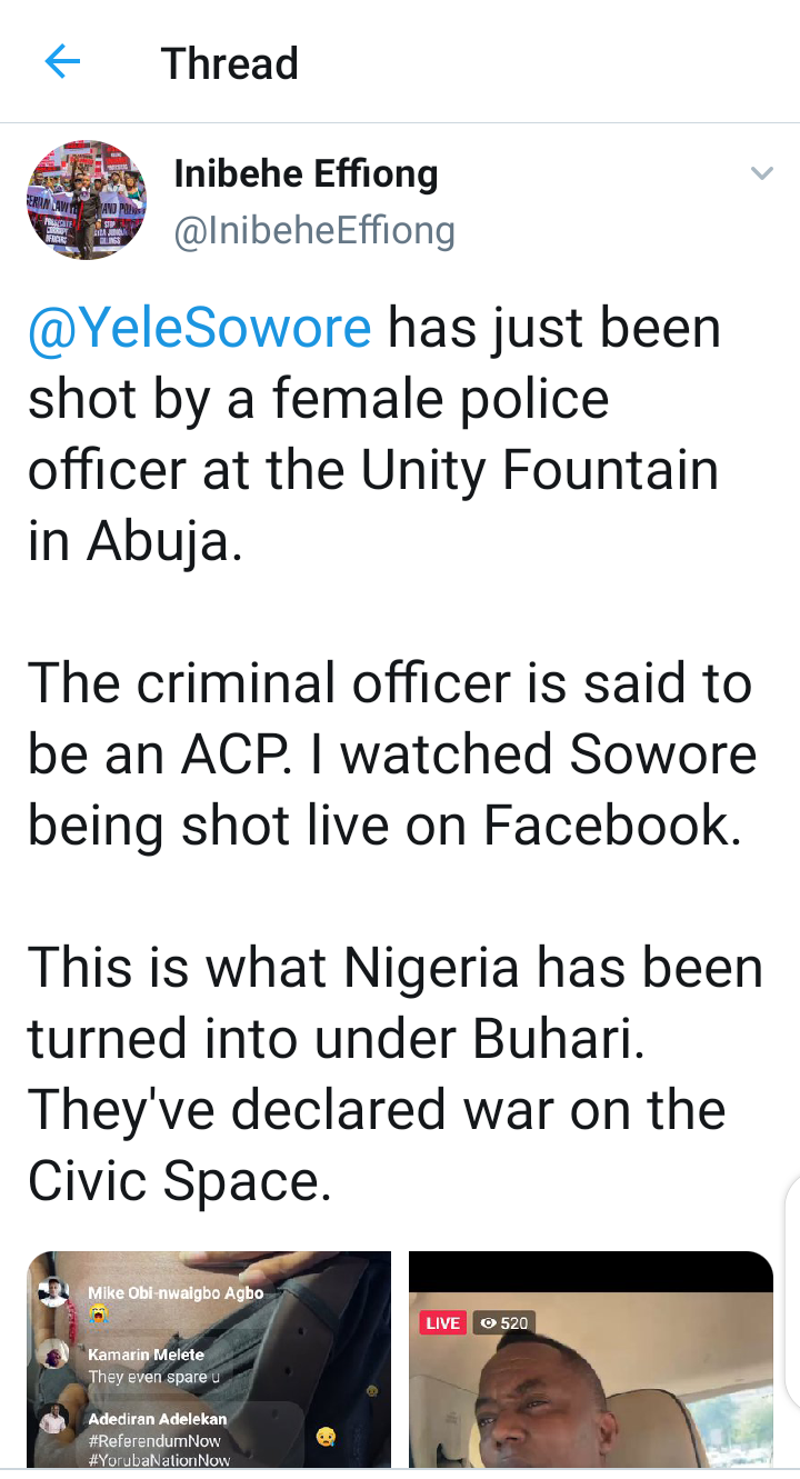 A human rights lawyer, Inibehe Effiong says he witnessed founder of Sahara Reporters, Omoyele Sowore being shot by a female police officer at the Unity fountain Abuja.