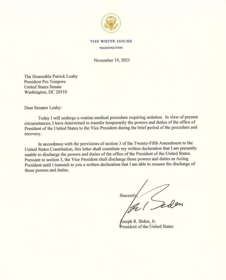The letter reads: “Today I will undergo a routine medical procedure requiring sedation. In view of present circumstances, I have determined to transfer temporarily the powers and duties of the office of President of the United States to the Vice President during the brief period of the procedure and recovery.”