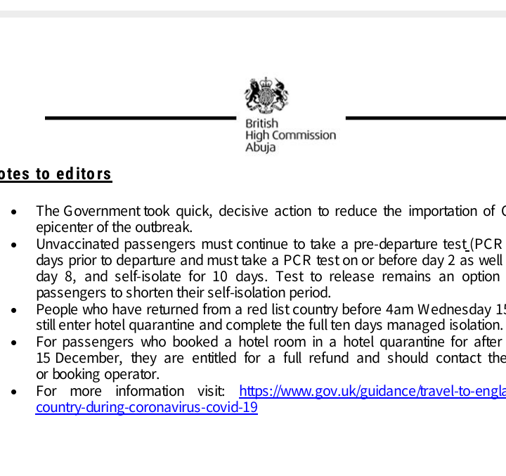 The UK government says it has removed Nigeria and 10 other countries from it’s travel ban list.