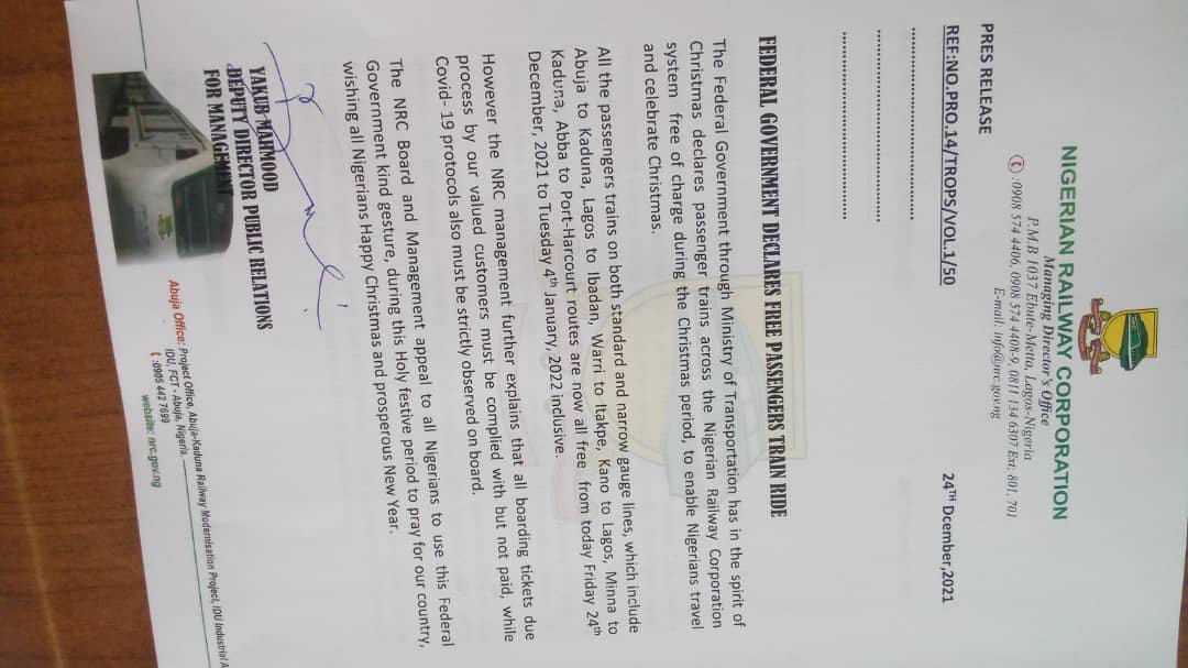 The statement called on Nigerians to pray for our country Nigeria as they enjoy the kind gesture. NRC further wished Nigerians a happy Christmas and prosperous new year.