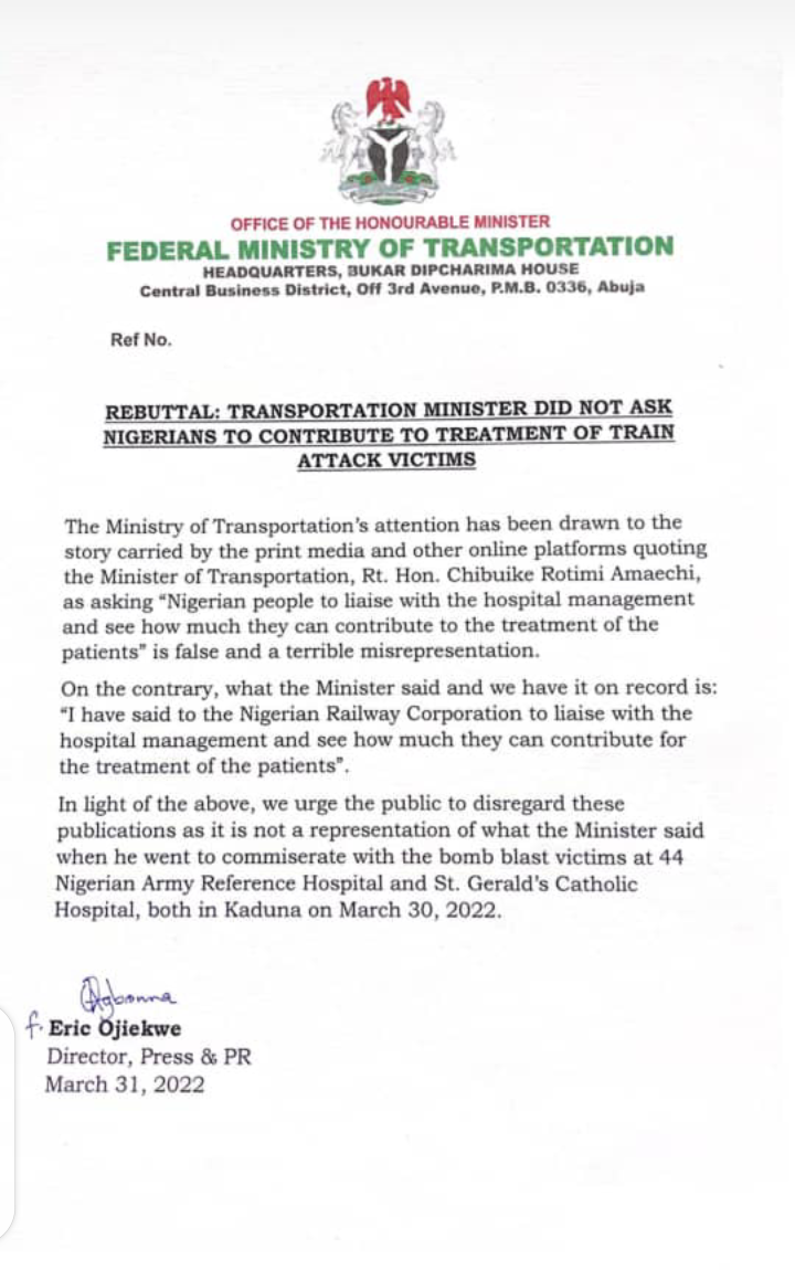 Following reports in some sections of the media that the Minister of Transportation , Rotimi Amaechi requested Nigerians to Contribute Money for the hospital bills of Victims of the Kaduna train attack, the Minister has described such statements as malicious and misrepresentation.