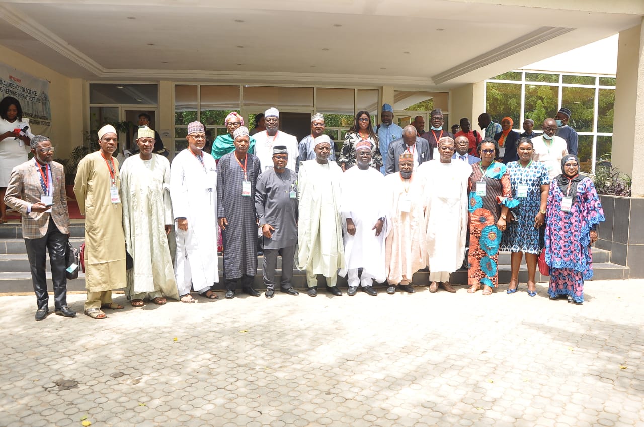 James Sule and on the left by the representative of Honourable Minister of FCT, Mal. Muhammad Bello, represented by Engr. Ferdinand Ezeoha, Director Engineering Services and other members of NASENI Technical Board and NASENI Management staff in group picture during the opening ceremony of the Retreat.
