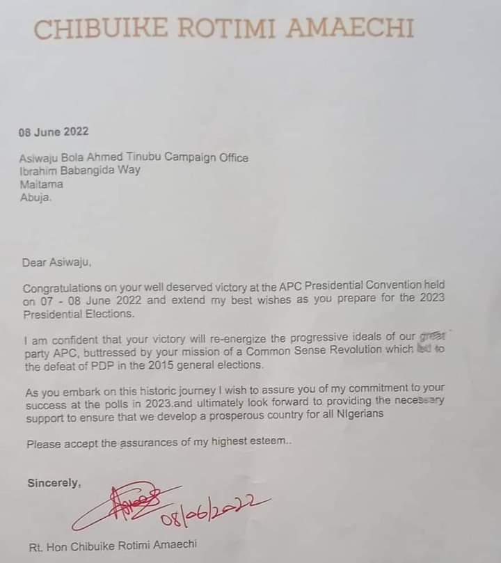 In a letter signed by Amaechi, he expressed confidence that the former’s victory will reenergize the party’s ideals and gave assurance of his commitment to ensuring that Ashiwaju succeeds in his journey to the Presidency come 2023.