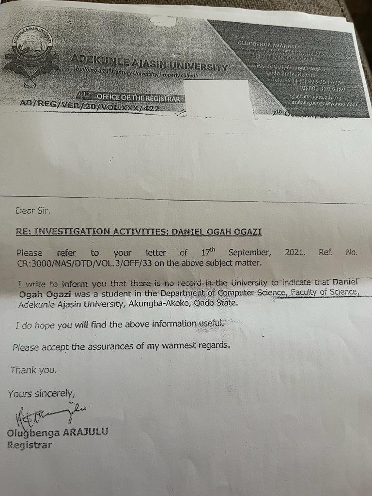 “I write to inform you that there is no record in the University to indicate that Daniel Ogah Ogazi was a student in the Department of computer science, faculty of science, Adekunle Ajasin University, Akungba-Akoko, Ondo state