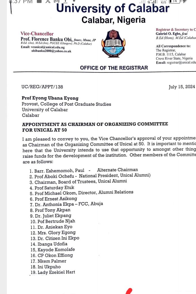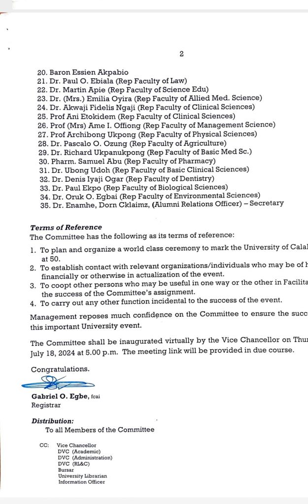 The committee which is chaired by Prof. Eyong Eyong the provost, college of postgraduate studies has Barr Eshemomoh Paul as alternate chairman and Dr Dom Cklaimz Enamhe,alumni relations officer as Secretary.