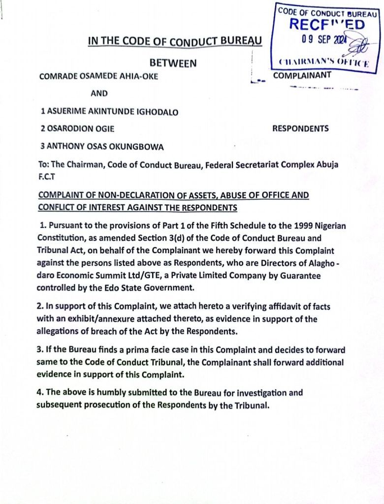In a petition and affidavit of facts submitted to the Code of Conduct Bureau and Tribunal sighted by Newsannex, it was alleged that the PDP candidate failed to declare his actual assets after assuming office as Chairman of Alaghodaro Economic Summit Ltd/GTE, a company owned and controlled by the Edo State Government.Pursuant to Paragraph 11(1) of Part 1 of the Fifth Schedule to the 1999 Nigerian Constitution (as amended), and Section 15 of the Code of Conduct Bureau and Tribunal Act, the PDP candidate was required to declare his assets to the Bureau.