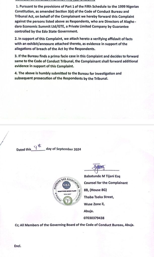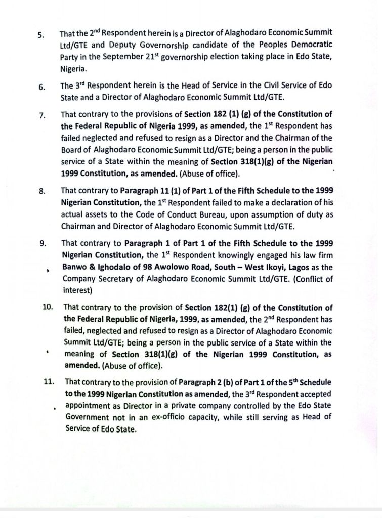 Furthermore, contrary to Paragraph 1 of Part 1 of the Fifth Schedule to the 1999 Constitution, the first respondent engaged his law firm, Banwo & Ighodalo of 98 Awolowo Road, Southwest Ikoyi, Lagos, as Company Secretary of Alaghodaro Economic Summit Ltd/GTE, which constitutes a conflict of interest and a breach of the Code of Conduct outlined in the Fifth Schedule of the Constitution.It was also noted that, contrary to Section 182(1)(g) of the Nigerian Constitution (as amended), the second respondent failed, neglected, and refused to resign as Director of Alaghodaro Economic Summit Ltd/GTE, despite being in public service in Edo State, as defined by Section 318(1)(g) of the Nigerian Constitution (as amended).Additionally, the third respondent, contrary to Paragraph 2(b) of Part 1 of the Fifth Schedule to the 1999 Constitution (as amended), accepted an appointment as a Director in a private company controlled by the Edo State Government, not in an ex-officio capacity, while still serving as Head of Service of Edo State.
