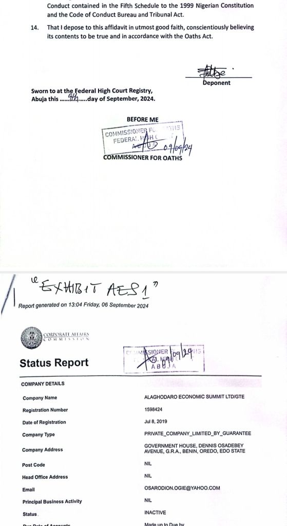Furthermore, under Section 182(1)(g) of the Constitution, both Ighodalo and Ogie were expected to resign from their positions as Directors of the state-owned company prior to the election.The affidavit, obtained by our correspondents in Abuja, reveals that the first respondent is currently the Chairman/Director of Alaghodaro Economic Summit Ltd/GTE and the governorship candidate of the People’s Democratic Party (PDP) in the September 21st governorship election in Edo State, Nigeria.