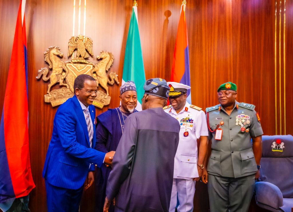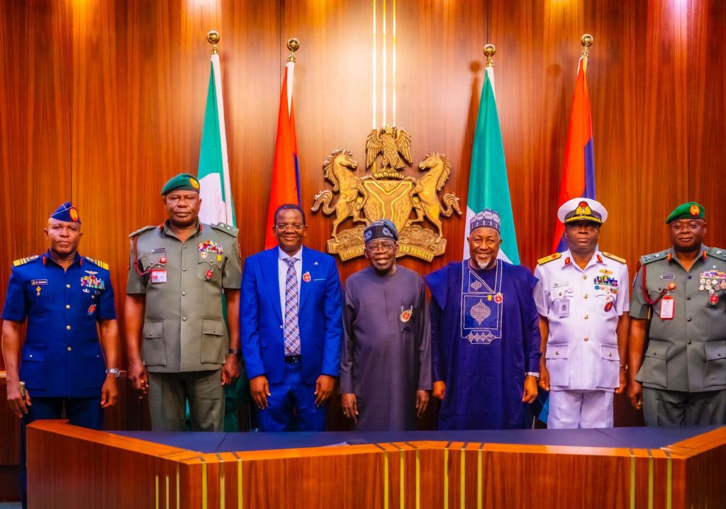 THE HONORABLE MINISTER OF DEFENCE, H.E MOHAMMED BADARU ABUBAKAR, CON, mni, AND THE HONOURABLE MINISTER OF STATE FOR DEFENCE H.E DR MUHAMMED BELLO MATAWALLE MON , TODAY TUESDAY, 5TH OF NOVEMBER 2024, WITNESSED THE DECORATION OF THE ACTING CHIEF OF ARMY STAFF MAJOR GENERAL OLUFEMI OLATUBOSUN OLUYEDE BY PRESIDENT BOLA AHMED TINUBU, GCFR, WITH THE RANK OF LIEUTENANT GENERAL IN A BRIEF CEREMONY AT THE STATE HOUSE.