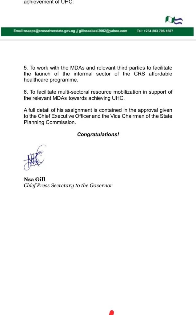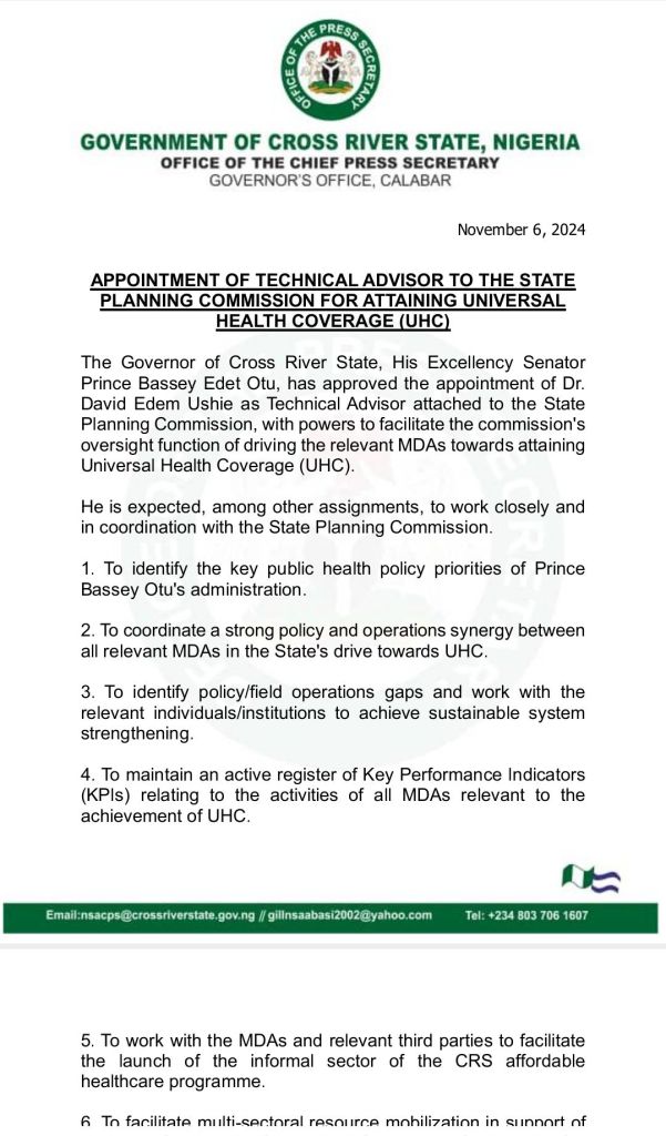The governor of Cross River State Prince Bassey Otu ,appointed Dr David Ushie Technical Advisor to the committee on universal health coverage .