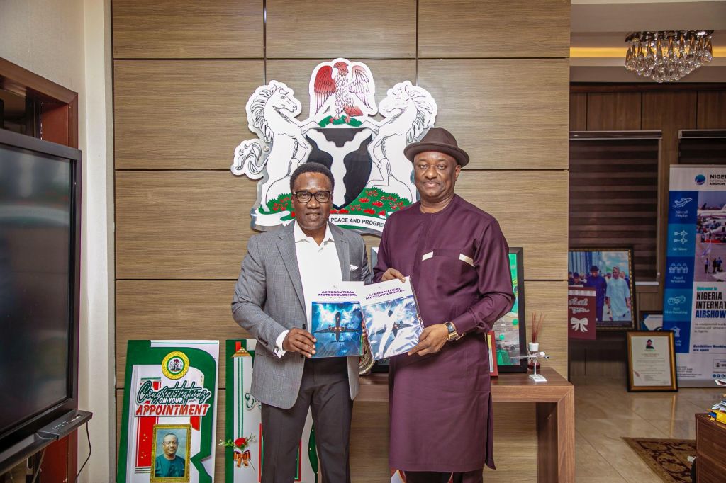 Minister of Aviation and Aerospace Development Festus Keyamo, SAN, (Right) and Professor Charles Anosike, the Director General and Chief Executive Officer of the Nigerian Meteorological Agency (NiMet) at the Minister’s office during the unveiling of NiMet’s new publication, Aeronautical Meteorological Bulletin, on Monday, 9th December 2024.