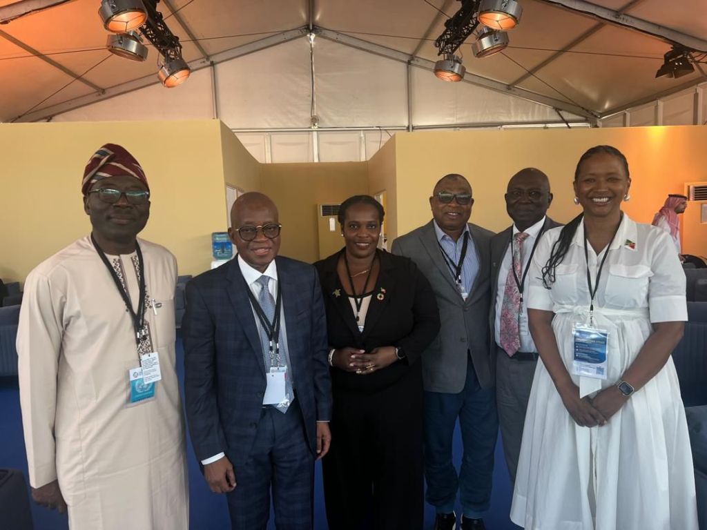 L-R: Permanent Secretary of the Federal Ministry of Marine and Blue Economy, Mr. Olufemi Oloruntola; Honourable Minister of Marine and Blue Economy, His Excellency Adegboyega Oyetola CON; Saint Kitts and Nevis’ Minister of Sustainable Development, Environment, Climate Action and Constituency Empowerment, Dr Joyelle Clarke; Managing Director, National Inland Waterways Authority (NIWA), Asiwaju Bola Oyebamiji; Director General, Nigerian Maritime Administration and Safety Agency (NIMASA), Dr Dayo Mobereola and the Permanent Secretary in the office of the Prime Minister of St. Kitts and Nevis, Naeemah Hazelle, during a meeting between both countries on the sidelines of the recently concluded 2025 United Nations Ocean Conference in Nice, France.