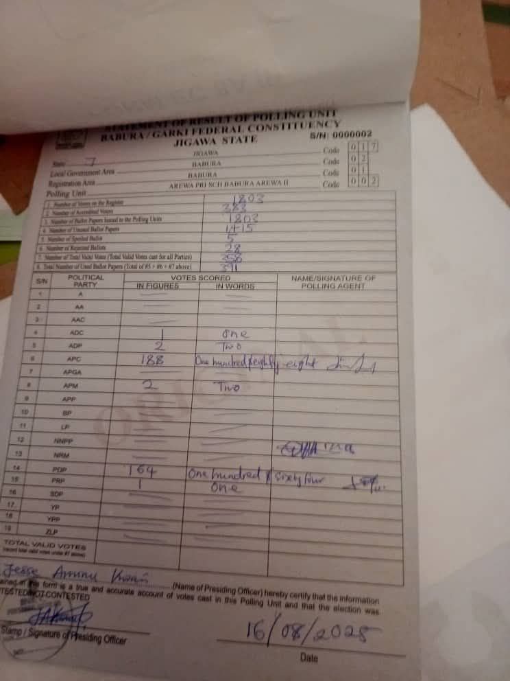 According to Mati, these authentic results confirm a clear victory for APC at Babura Kofar Arewa Primary School, Polling Unit 002.