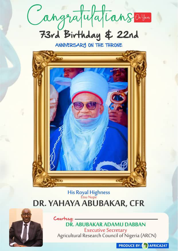 By Ada Nkong The Executive Secretary, Agricultural Research Council of Nigeria, (ARCN) Dr. Abubakar Adamu Dabban has described the Etsu Nupe ,Dr. Yahaya Abubakar as a father and mentor to the entire kingdom. This was contained in his birthday felicitations to the Etsu Nupe, a first class traditional ruler who has been on the throne… Continue reading 22nd Anniversary: ARCN Executive Secretary Celebrates Etsu Nupe @ 73Â