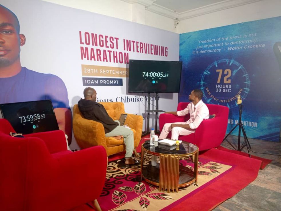 By Ada Nkong A young Nigerian journalist Livinus Chibuike Victor has achieved an exceptional feat by beating the current 55 hours 24 record for the world’s Longest Interview Marathon, which he did with 74 hours 10 Seconds, despite setting 72 hours 30 Seconds for himself.From Sunday, September 28 to Wednesday October 1st, 2025, Victor… Continue reading GWR: Chibuike Victor Breaks Record for Longest Interview,Awaits Official Recognition