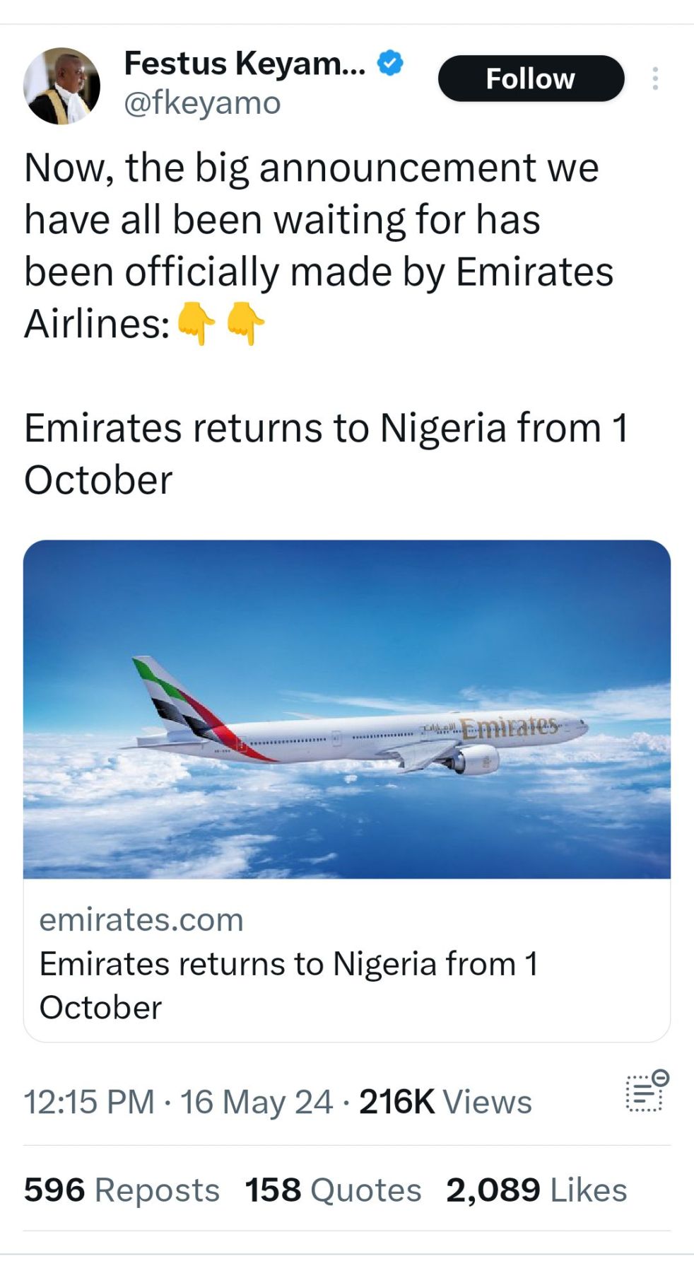 By Ada Nkong Minister of Aviation and Aerospace Development,Festus Keyamo has announced the return of Emirates airline to Nigerian Skies. On his X page, the minister said it was time for the big announcement and then disclosed that Emirates will resume flights in Nigeria on October 1. On the Emirates website, it says a daily… Continue reading Keyamo Announces Emirate Return to Nigeria Skies