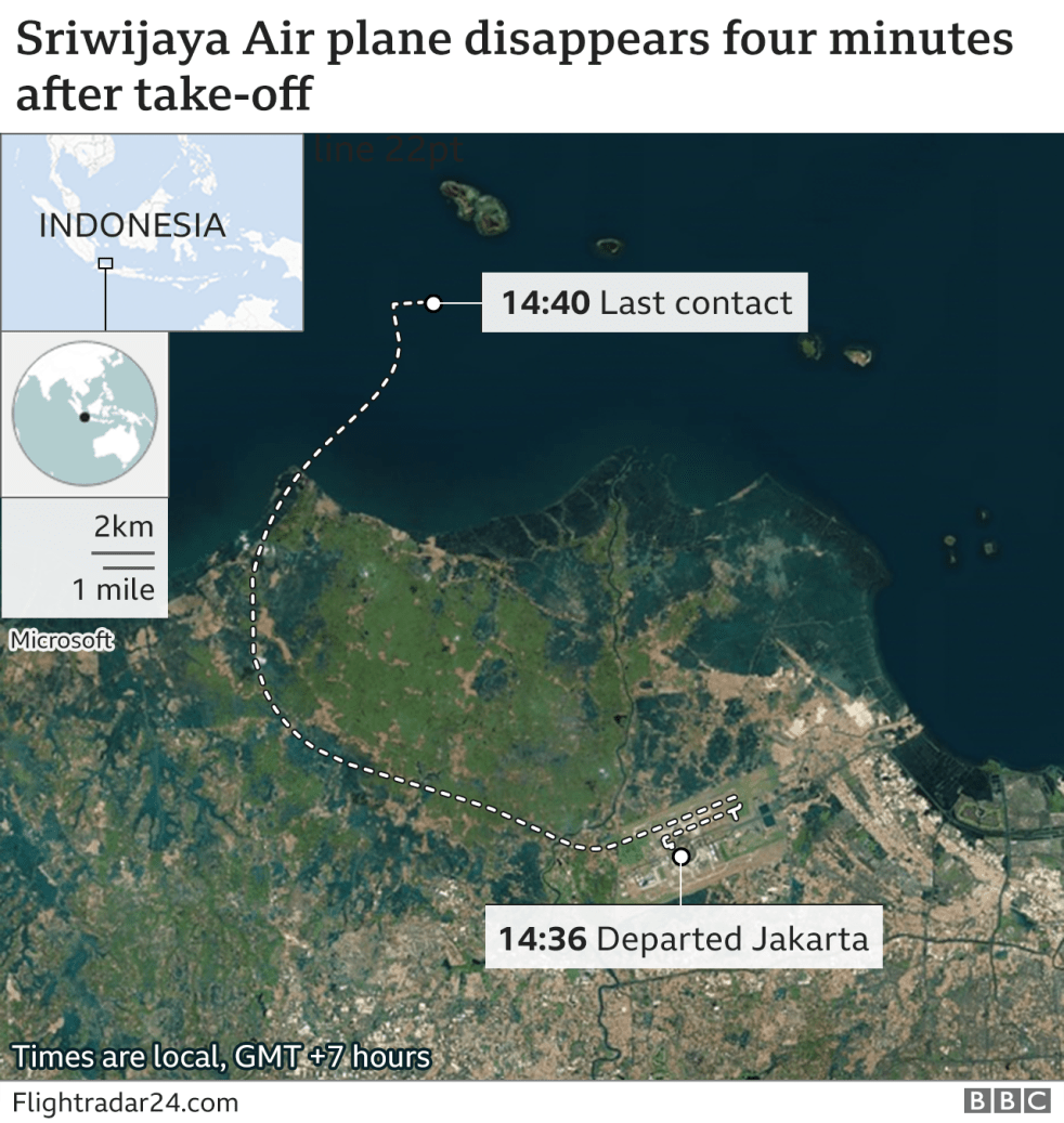 Relatives of Passengers, waiting for feedback A passenger plane with an estimated 62 people on board has gone missing shortly after take-off from the Indonesian capital Jakarta. The Sriwijaya Air Boeing 737 lost contact en route to Pontianak in West Kalimantan province, officials said. Flight tracking website Flightradar24.com said the aircraft had lost more than… Continue reading Indonesia Plane Disappears With Passengers 4 Minutes After Take Off_Ada Nkong
