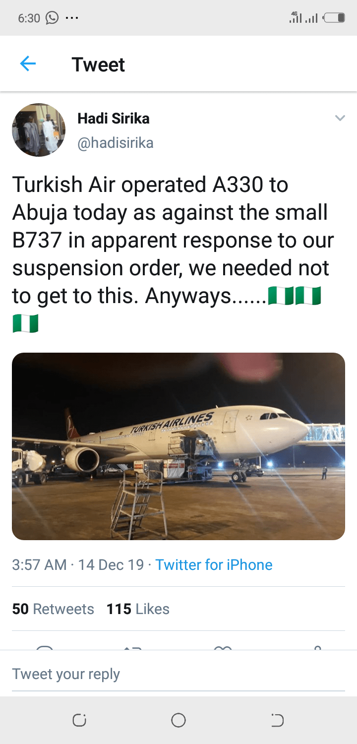 Following suspension of its services and subsequent meeting with the Minister of aviation where it pledged to review the airline it flies to Nigeria, Turkish Airline has kept its word. A tweet by the Minister of Aviation, Hadi Sirika on his official twitter handle says the airline flew a bigger craft A330 as against the… Continue reading TURKISH AIRLINE COMPLIES_Ada Nkong