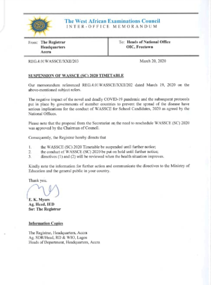 The West African Examination Council, WAEC says it is suspending its earlier released timetable in line with Federal government directives to avoid large gatherings. Details soon....