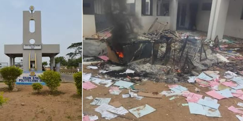 The management of Osun State Polytechnic, Iree, has closed down the institution indefinitely over the protest by students which turned violent and led to the destruction of some properties at the school’s medical centre. It was reported that an HND 1 student of Applied Science identified as Aminu Sheu fainted yesterday afternoon soon after he finished his… Continue reading OSUN STATE POLITECHNIC SHUT DOWN WITH IMMEDIATE EFFECT
