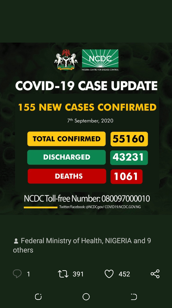 The NCDC has announced 155 more Covid-19 cases. The total confirmed so far is 55160 .While 43231 patients have been discharged, 1061 deaths have occurred. Lagos has 42 cases, Plateau 25 and Rivers 16. Kano has just 1 case.