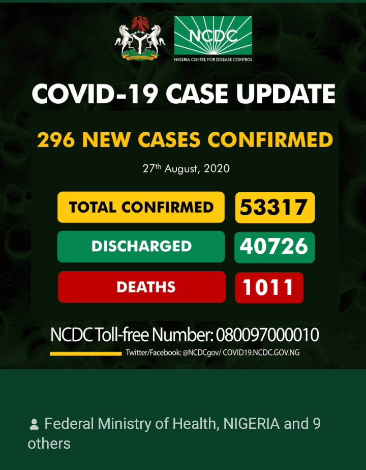 The NCDC has reported 321 new cases. Of these,Lagos has 98,FCT 34, Kaduna 30, Nasarawa 25.Abia and Bauchi have 1 case each. The total number of confirmed cases stands at 52548, 39257 have been discharged while 1004 have died so far.