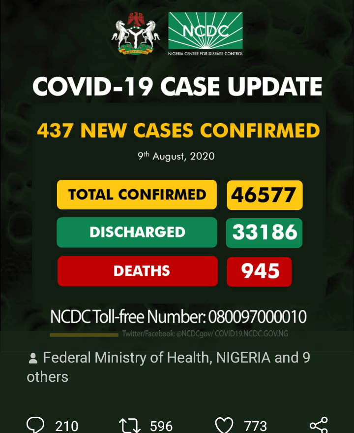 The total number of Covid-19 cases confirmed in Nigeria has risen to 46577 with 437 fresh cases confirmed. Lagos has 107 while FCT accounts for 91 of the new cases.