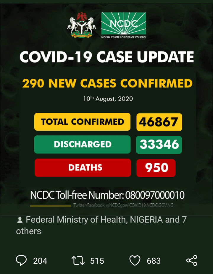Coronavirus deaths in the country have risen to 936. With 443 new Coronavirus infections recorded on Friday, August 7, 2020, Coronavirus cases confirmed in Nigeria have now risen to 45,687. The Nigeria Centre for Disease Control (NCDC) recorded the new cases in 18 states and the Federal Capital Territory, Abuja. In its daily updates on… Continue reading Nigeria records 443 new Coronavirus cases_Femi Ehiabhi