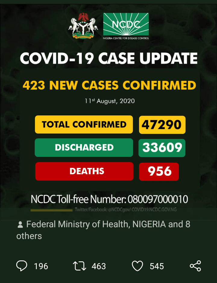 The total number of Covid-19 cases confirmed in Nigeria is now 47290 with 423 more cases confirmed. That is a slight increase over the daily cases for a few days now. Lagos still leads with 117 cases followed by FCT with 40 cases. Nasarawa state has just 1 case.